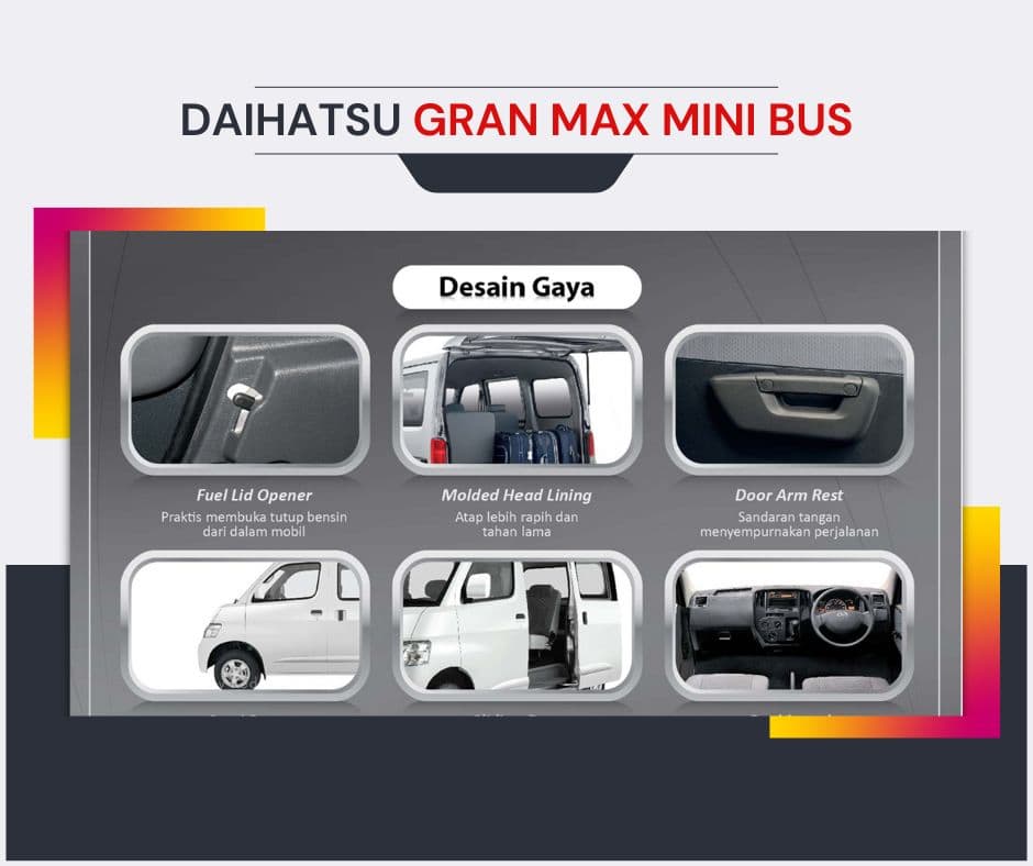 Desain yang modern serta fitur interior yang ergonomis menjadi daya pikat utama bagi mobil komersil Daihatsu satu ini. Berbagai fitur terbaik di kelasnya seperti ketahanan banjir terbaik di kelasnya, bak serta ruang penyimpanan terluas di kelasnya, dan chasis paling tebal di kelasnya juga memastikan Daihatsu GranMax dapat memenuhi kebutuhan komersil di seluruh medan yang tidak menentu di Indonesia.