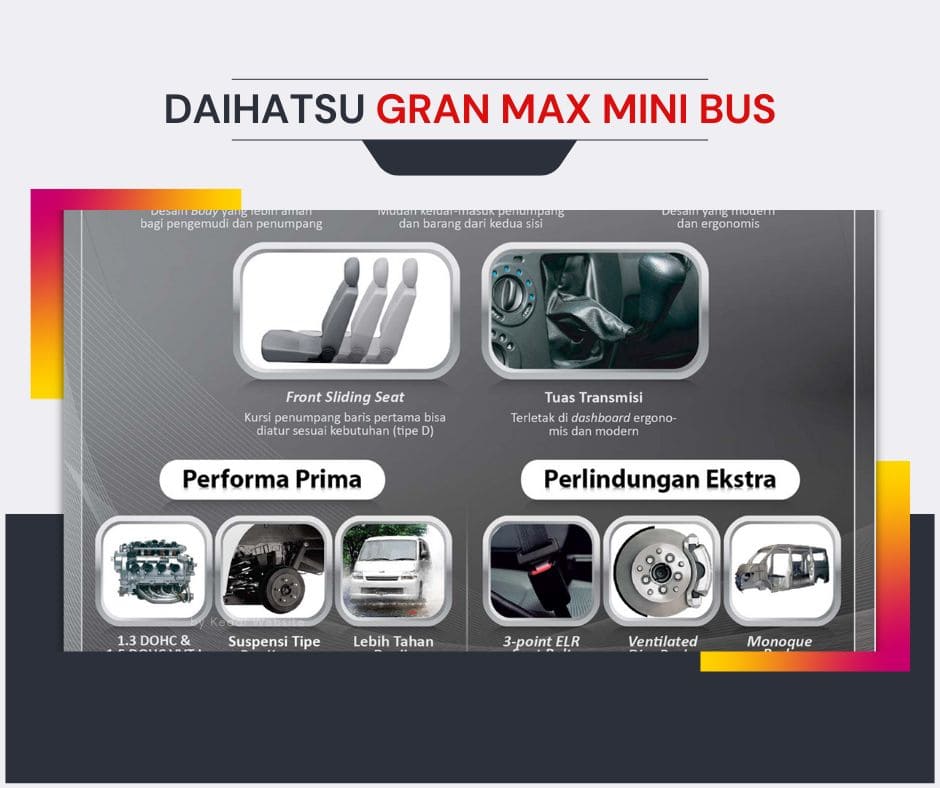 Daihatsu GranMax tentu sudah tidak perlu diragukan lagi sebagai kendaraan serbabisa yang memiliki ketangguhan luar biasa, baik untuk kendaraan pribadi sehari-hari maupun kebutuhan kendaraan komersil Anda. Dibekali dengan dua pilihan mesin serta banyaknya jenis kendaraan yang dapat dipilih, mulai dari mobil penumpang, mobil Box, mobil Pick Up, sampai dengan Blind Van, dipastikan Daihatsu GranMax dapat menjadi solusi berkendara bagi Anda.